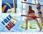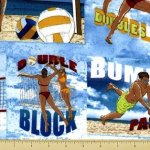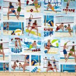 Bunk, block, free ball words and volleyball scenes on the beach.